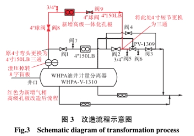 通過在原油井計(jì)量分離器氣相出口增加1路氣相計(jì)量管線和高級(jí)一體化孔板流量計(jì),實(shí)現(xiàn)不同氣量的油井在不拆卸更換孔板的情況下,利用切換流程使用相對(duì)應(yīng)的測(cè)量范圍的孔板進(jìn)行計(jì)量。