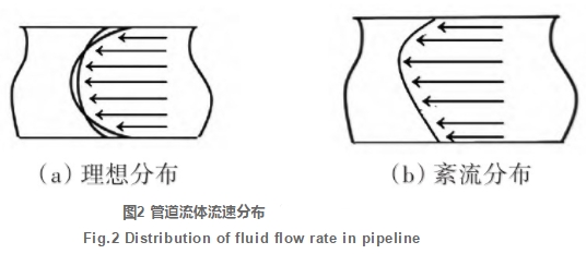 (2)在圓形管道中流體充分發(fā)展后,管道中間的流速比較均勻,但是管壁處流速梯度較大。圖2(a)為理想流速分布,當(dāng)雷諾數(shù)較小時弧度較大,對應(yīng)流速差別也大。但由于現(xiàn)場管道安裝復(fù)雜(例如有大量彎管、閥門等),實際流速分布如圖2(b)所示。若流速越低,則不同位置流速差異越速同時伴隨著素流或渦流產(chǎn)生,所以在實際應(yīng)用中管道內(nèi)平均流速很難準(zhǔn)確測得。