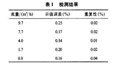 該電磁流量計已經(jīng)得到應(yīng)用,并依據(jù)JJG198-94《速度式流量計檢定規(guī)程》,利用質(zhì)量法水標準裝置,對采用基波平均值信號預(yù)處理電路的電磁流量計進行檢定,重復(fù)性誤差為0.1%,基本誤差為0.25%,線性度0.3%,檢測結(jié)果如表1.