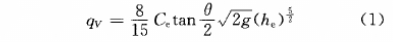 式中:qv--體積流量,m³/s;Ce--流量系數(shù)(需查表);θ--角缺口夾角,20°≤θ≤100°;he--有效水頭,m,he=h+Kh(h-實測水頭,m,Kh--水頭修正系數(shù))。