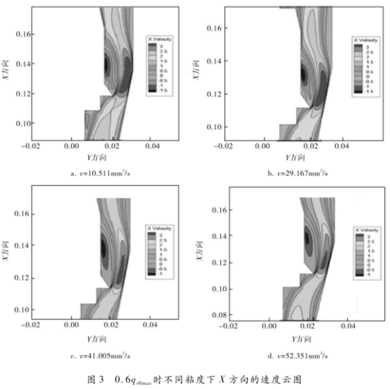 為了直觀地反映同一流量點(diǎn)不同粘度下流量傳感器中速度的變化,選取0.6qyDmax時(shí)不同粘度.下X方向速度進(jìn)行分析,速度云圖如圖3所示。