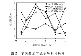 令仿真流量為q,則相對誤差δy=1(qf-qv0)I/qy0×100%,不同粘度下流量的相對誤差如圖2所示。