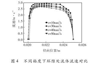 從圖4可以看出,環(huán)隙處流體的速度隨著粘度的增大而減小。原因是同一刻度流量下,環(huán)隙的面積是相同的,而流體介質(zhì)的粘度增大,則其內(nèi).部摩擦力消耗增大,使流過環(huán)隙處的速度降低。
