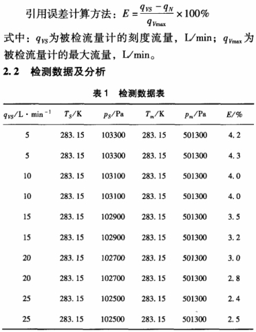 選用標(biāo)準(zhǔn)氣表,對高金屬管浮子流量計(jì)進(jìn)行在線實(shí)流檢測。當(dāng)標(biāo)準(zhǔn)氣表和被檢測流量計(jì)的流量達(dá)到穩(wěn)定時(shí),讀取標(biāo)準(zhǔn)氣表和被檢測流量計(jì)的指示流量,記錄標(biāo)準(zhǔn)氣表和被檢測流量計(jì)進(jìn)口處的壓力、溫度,計(jì)算被檢測流量計(jì)的實(shí)際流量。工作介質(zhì)經(jīng)過在線高壓被檢浮子流量計(jì)后,氣體壓力大幅度降低,進(jìn)人標(biāo)準(zhǔn)氣表的氣體壓力已是常壓,所以被檢高壓浮子流量計(jì)和標(biāo)準(zhǔn)氣表都可正常工作。